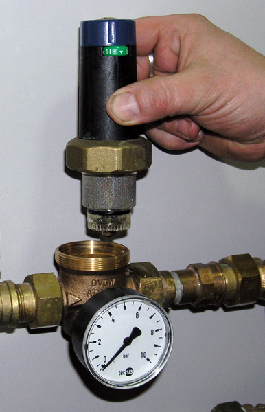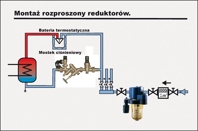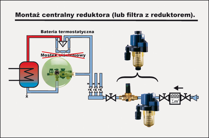 Może się jednak zdarzyć, że nie będziemy mieć dostępu/dojścia do głównego przyłącza zasilania w wodę i reduktor zainstalujemy tylko w strefie zasilanie podgrzewacza wody. Jest to jednak najmniej korzystny z możliwych przypadków, ponieważ w sytuacji, gdy w instalacji pracują baterie termostatyczne, może nastąpić zjawisko tzw. mostka ciśnieniowego. Otwarcie baterii powoduje dostanie się zimnej wody o wysokim ciśnieniu (takim jak na zasilaniu) do przewodów doprowadzających ciepłą wodę o niższym ciśnieniu. W efekcie notujemy wzrost ciśnienia w instalacji wody ciepłej i kapanie z zaworu bezpieczeństwa. Aby uniknąć tego zjawiska, reduktor (lub filtr z reduktorem) musi być zainstalowany centralnie – obniżenie ciśnienia powinno dotyczyć zarówno ciepłej jak i zimnej wody.