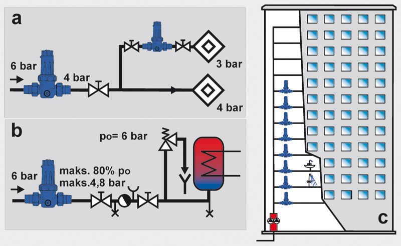 c – w układach zaopatrywania – wieżowców przez instalacje podnoszenia ciśnienia, gdy potrzebna jest większa liczba stref ciśnienia.